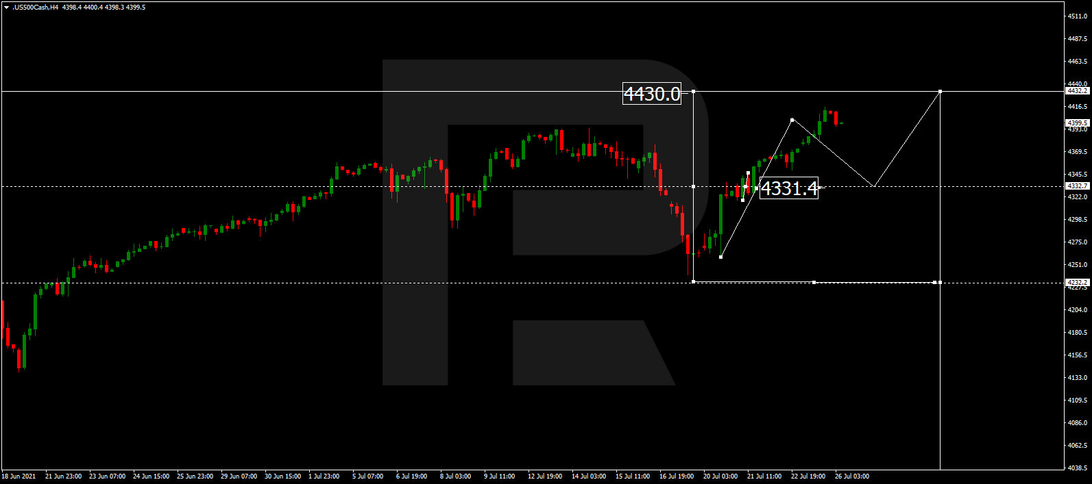 The S&P index is still consolidating around 4331.4. Today, the asset may expand the range up to 4430.0 and then start a new decline to return to 4331.4. If the price breaks this with, the market may continue falling with the first target at 4232.2.