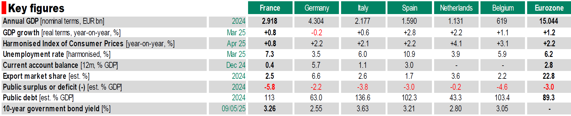In addition to the comparative table, which presents the key economic data for each economy studied (France, Eurozone, Germany, Italy, Spain, the Netherlands, Belgium and the United Kingdom), other summary tables of indicators enrich the comparison.