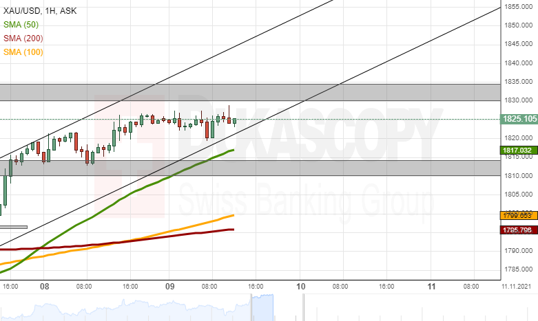 A potential surge might start, as soon as the price reaches the support of the channel up pattern and the 50-hour simple moving average, which are both approaching the pair. A move upwards would test the resistance of the summer high-level zone at 1,830.00/1,835.00.