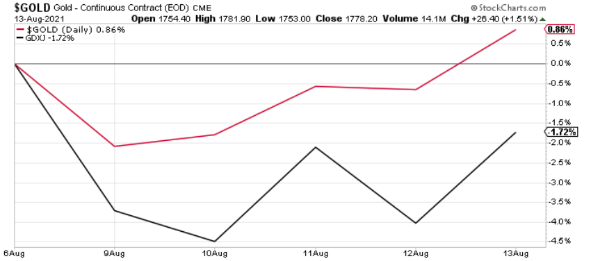 While gold shrugged off the Aug. 8 ‘flash crash’ and bounced back above its June lows, the yellow metal’s renewed sense of swagger hasn’t been mimicked by its precious metals peers. For example, while gold ended the week up by 0.86%, the GDXJ ETF (our short position) ended the week down by 1.72%.