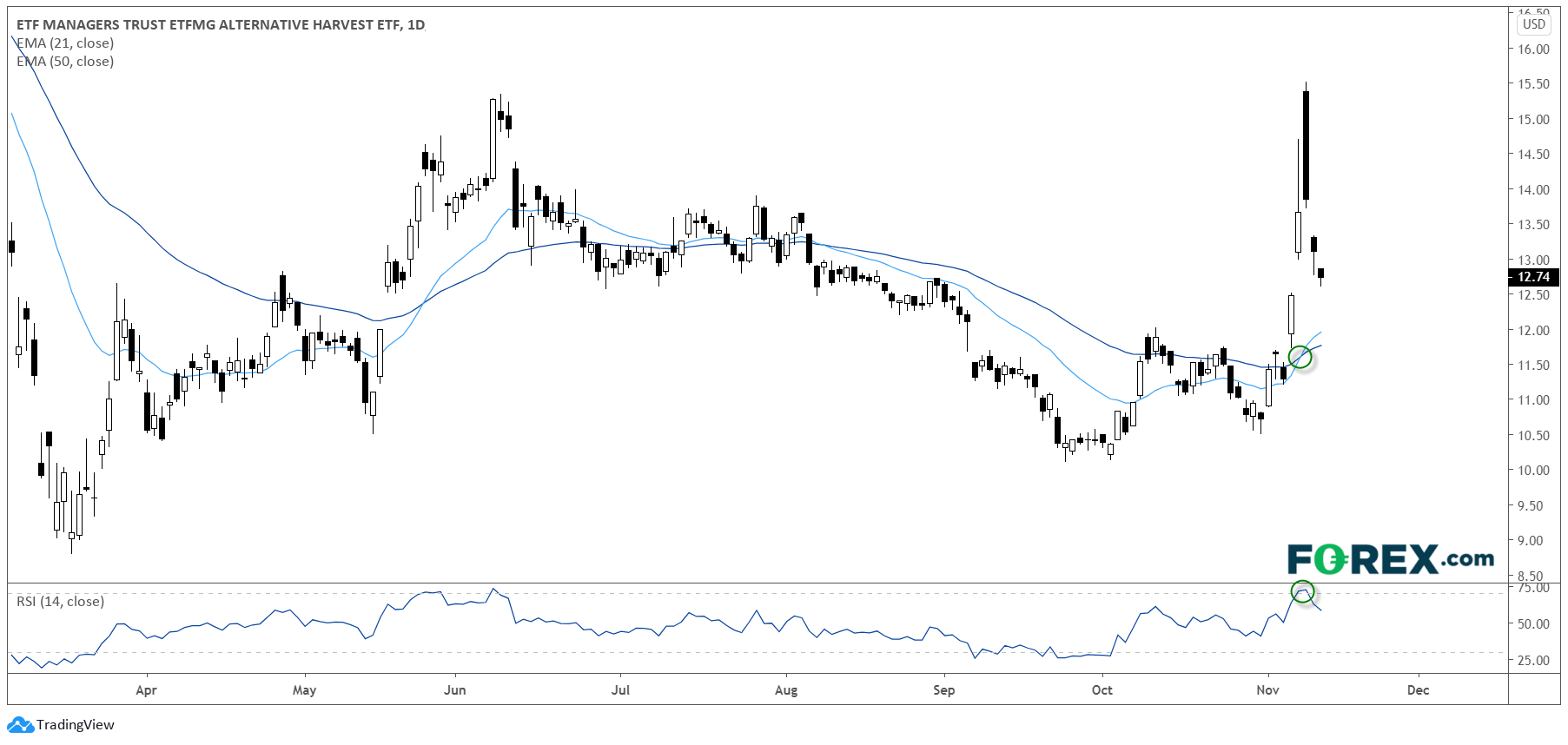 From a technical perspective, MJ has seen its 21-day EMA cross above its 50-day EMA, signaling a possible shift to a medium-term uptrend (though we did see a similar bullish crossover sputter out back in Q2). The RSI likewise reached "overbought" territory above 70 for the first time since June at the start of the week, a bullish sign from a medium-term perspective.