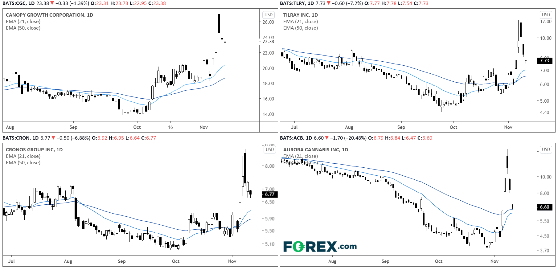 |Three months ago, we identified marijuana stocks as potential winners under a Biden presidency, noting that, "[r]elative to some of the more liberal Democratic candidates, Biden is seemingly lukewarm toward recreational marijuana, but the prospects of full legalization are nonetheless better under Biden than Trump, especially if the House of Representatives and/or Senate is also under Democratic control. In that case, stocks like Canopy Growth (CGC), GW Pharmaceuticals (GWPH), Curaleaf (CURL), Cronos Group (CRON), and Aurora Cannabis (ACB) could catch a bid..."