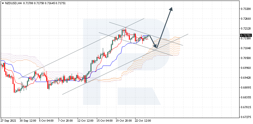 NZD/USD is trading at 0.7175; the instrument is moving above Ichimoku Cloud, thus indicating an ascending tendency. The markets could indicate that the price may test the cloud’s upside border at 0.7105 and then resume moving upwards to reach 0.7320. Another signal in favour of a further uptrend will be a rebound from the rising channel’s downside border. However, the bullish scenario may no longer be valid if the price breaks the cloud’s downside border and fixes below 0.7025. In this case, the pair may continue falling towards 0.6935. To confirm further growth, the asset must break the descending channel’s upside border and fix above 0.7215.
