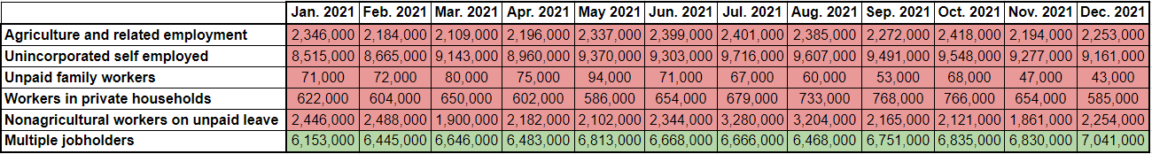 From June to July, every category that is subtracted increased while the opposite happened from October to November. Changes in the “multiple jobholders” category, which is added, were relatively small. Total subtraction from the CPS employment figure jumped to 9,477,000 in July from 8,103,000 in June while it dropped to 7,203,000 in November from 8,086,000 in October.