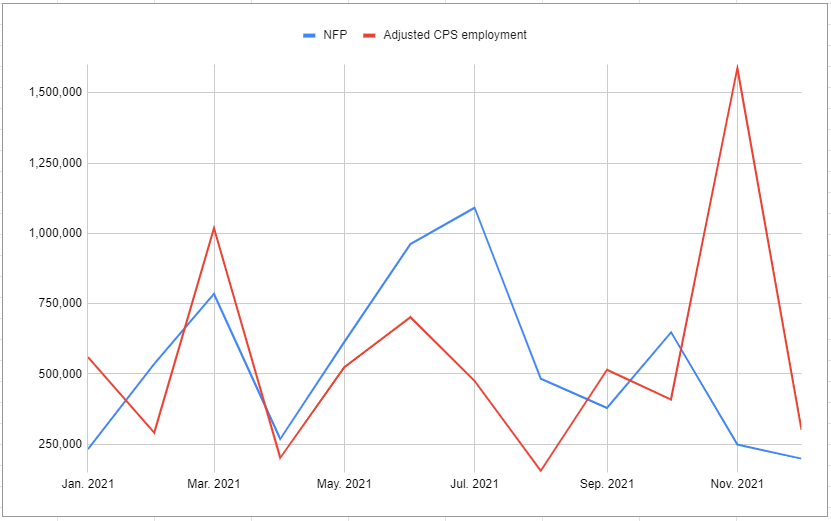 In July 2021, NFP was 1,091,000 and the adjusted CPS employment was 475,000. On the flip side, these figures were 249,000 and 1,588,000 respectively, in November. The biggest divergences between the monthly changes occurred in these two months in 2021.