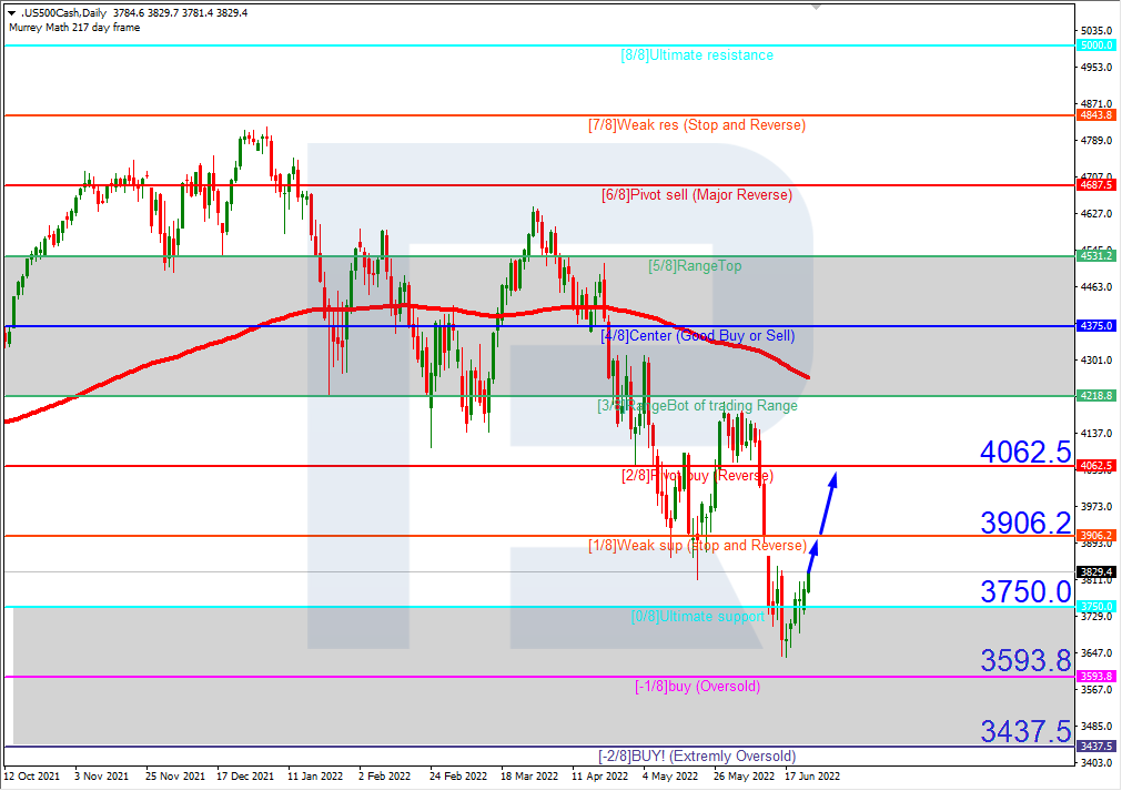 In the H4 chart, after breaking 0/8, the S&P Index is trading outside the “oversold area”. In this case, the price is expected to test 1/8, break it, and then continue growing towards the resistance at 2/8. However, this scenario may no longer be valid if the asset breaks the support at 0/8 to the downside. After that, the instrument may reverse and fall to reach -1/8.