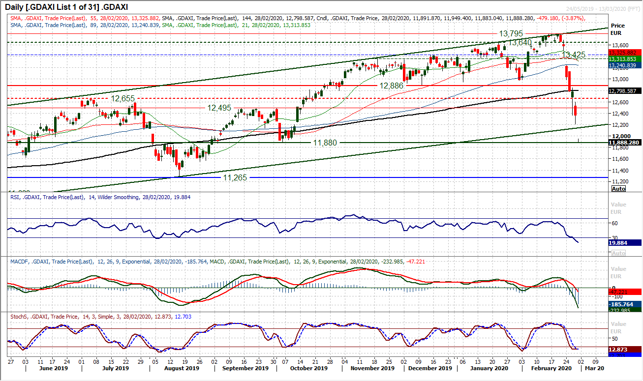With the DAX falling off a cliff (along with all other equity markets) in the past six sessions, it is an important time to see where the analysis sits. Dropping over -10% lower from the all-time high of 13,795 sees the DAX in official correction territory. Key support levels have been broken on the way but it is a move that is still just a retreat within a well-defined long term uptrend channel which comes in as a basis of support at 12,140 today. The RSI is well into oversold territory into the low 20s, but there is little reason to expect a sustainable rebound right now. Volatility on the DAX is understandably elevated right now, with the Average True Range of 228 ticks at six month highs, whilst the market closed well below the 2.0 SD Bollinger Bands yesterday. However, the market is getting smashed again early today and the channel is breaking now. The focus will be on the September low of 11,880 which marks a significant long term pivot level and is key support now. A breach would bring the August 2019 low of 11,265 into play, and this is a crucial support. The bulls need just to stem the tide of selling, even small losses would be a bonus right now.