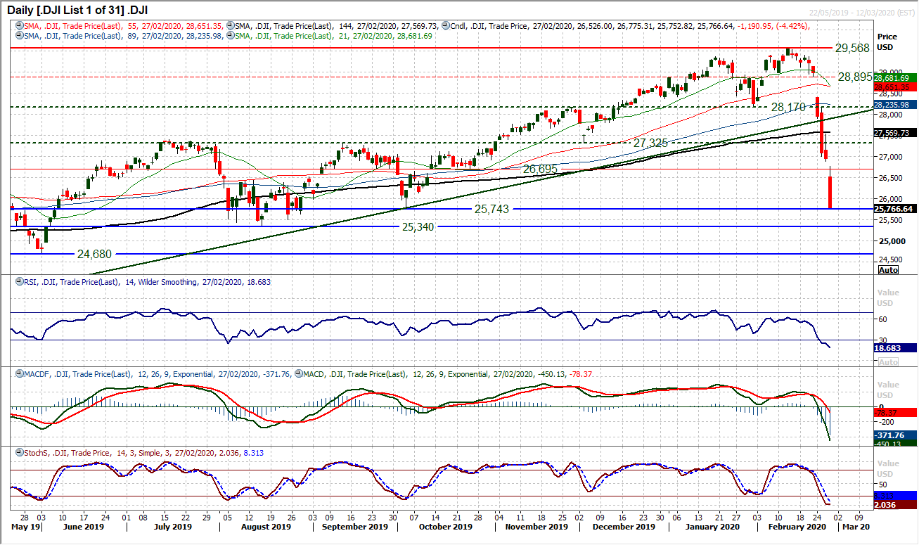 Falling another 1190 ticks yesterday, the Dow had its biggest one day decline since October 2008, where markets were in the teeth of the great financial crisis. Volatility is huge, with traders and investors selling what they can right now. The market has fallen through several major support levels in the past week and closed last night around the key October low of 25,743. The problem is that futures are pointing to another 1% to 2% decline at the open today, meaning that the key August low of 25,340 will be directly challenged early today. However, seeing as some major support levels have mattered little this week, the momentum of the selling pressure is just smashing through anything in its path. The RSI is around 18 today, with MACD and Stochastics very bearishly configured. This is very much reaching extreme territory though now. The Dow is trading way below its 2.0 SD Bollinger Bands, whilst volume in yesterday’s sell-off was at a 14 month high. It is difficult to know where the sell-off might end, but around the open today (if futures are anything to go by) the decline will be in the region of -14% in the two weeks since the all time high. That is extreme and contrarians will be taking note.