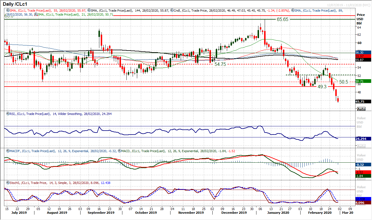 The oil price continues to be smashed. Day after day the selling pressure is hitting the market and having traded decisively clear below $49.30 the market is now eyeing the crucial December 2018 low of $42.35. Momentum indicators are bearish but also show further downside potential still. Once more this morning, the selling pressure is hitting the market. Intraday rallies are being seen though, but these are just unwinding moves before the next wave of selling. The hourly RSI around 40/50 is a zone of opportunity for the bears now. Initial resistance at $45.90/$47.00. It needs a rebound above $47.75 for the bulls to even contemplate the potential for a rally of substance.