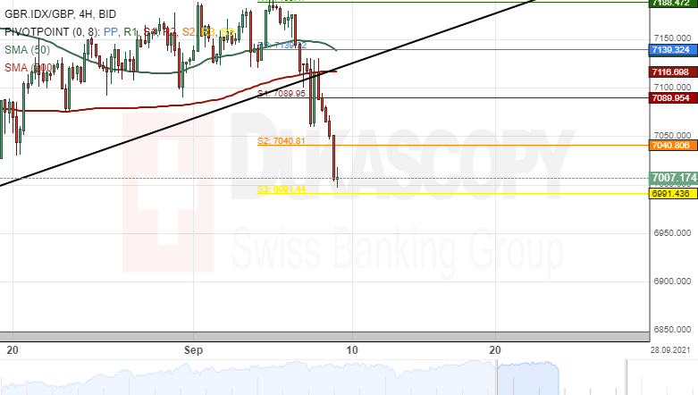 The Financial Times Stock Exchange 100 Index has declined by 1.88% since this week's trading sessions. A breakout occurred through the lower boundary of an ascending channel pattern on September 8.