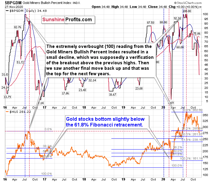 When GDX approached its 38.2% Fibonacci retracement, it declined sharply – it was right after the 2016 top. Are we seeing the 2020 top right now? This is quite possible – PMs are likely to decline after the sharp upswing, and since there is just more than one month left before the year ends, it might be the case that they move north of the recent highs only in 2021.