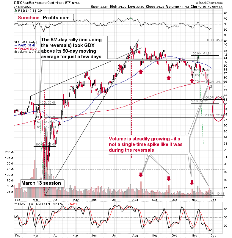 On Thursday (Nov 12 th ) and Friday (Nov 13 th ) of last week, miners moved and closed higher, but it’s important to note that their upswing was tiny and not accompanied by strong volume. In other words, it has all the characteristics of the breather that’s going to be followed by another move in the direction in which the market had been moving previously.