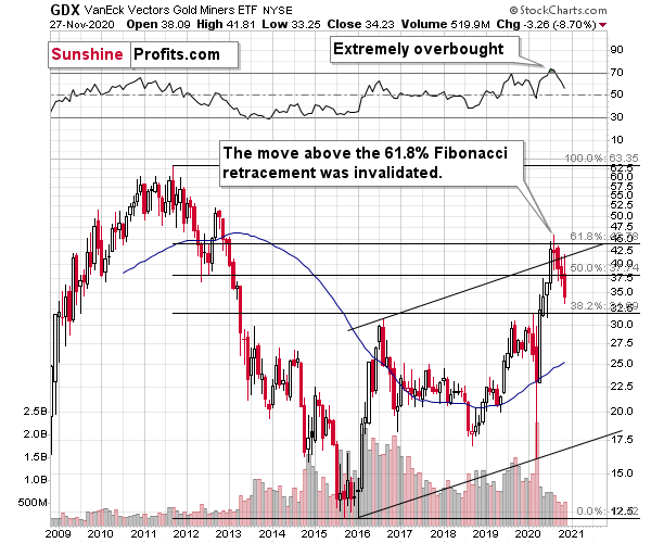 Also, let’s not forget that the GDX ETF has recently invalidated the breakout above the 61.8% Fibonacci retracement based on the 2011 – 2016 decline.