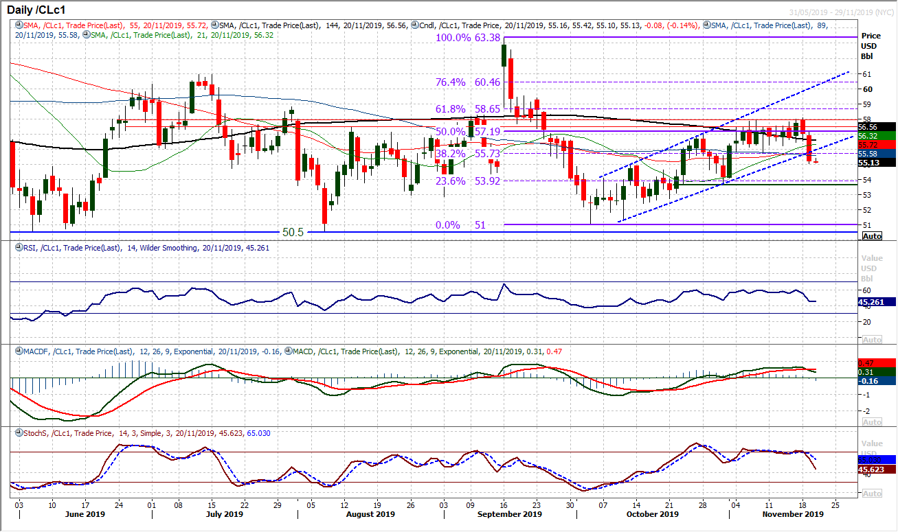 Has the outlook on oil changed again? A suggestion that Russia would not agree to further OPEC production cuts has driven the price of oil lower. A second decisive negative candle has not only broken the uptrend channel of the past five weeks, but also the support at $55.75. It comes also with sell signals on momentum, with a MACD bear cross and Stochastics also crossing lower. The reaction today will be key. If the old support band $55.75/$56.20 now becomes a basis of resistance, then this could quickly turn into a sustaining move to test the support of the key higher low at $53.70. The RSI moving below 40 would also be a corrective signal.