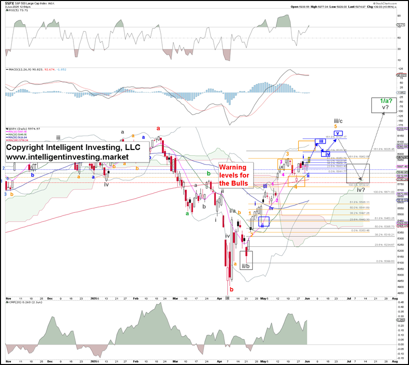 Namely, the April low was almost a 50% retracement of the October 2022 low to the February 2025 ATH rally. That is more typical B-wave behavior as 4th waves tend to retrace ~38.2%, which is why we were initially looking for the SPX to bottom around the $5,116 level. Moreover, the recent 2+ year rally can be counted as three (green) waves: red W-a.