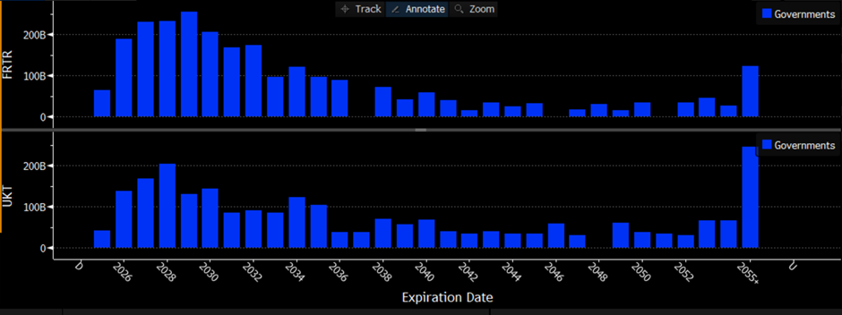 In the UK, our Debt Management Office has gone the other way, exhibited above by the value of bonds maturing in different years of France (top chart) and the UK (bottom). Instead, our issuance office has backloaded British debt, so that almost half of it pays off in 30+ years, great when the picture was settled and interest rates low in 2019, not so great in the high-rate, volatile climate we now inhabit.