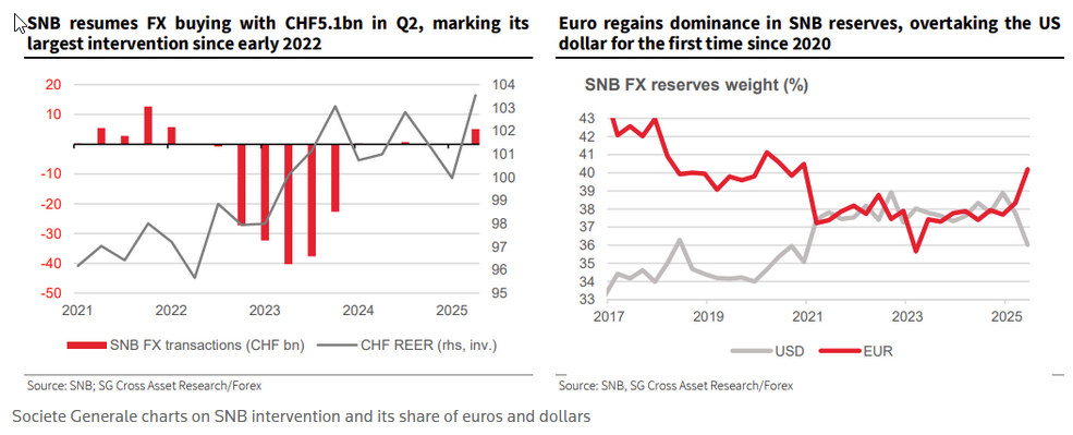 “The balance sheet readout showed the euro's share of Swiss reserve assets, opens new tab has now risen above the dollar stash for the first time since 2020 - with the euro at 39% and the dollar at 37%. … The SNB's trade-weighted currency basket shows the euro has a commanding 42% share but the dollar is only 14% - so there is ample room for further rebalancing of its reserves to match that.”