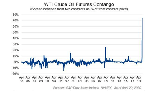 This market distortion is due to a variety of factors, including demand destruction, oversupply, pipeline delays, storage capacity, and popular oil ETFs rolling forward to next month’s June contract, making the May contract far more illiquid. By contrast, the June WTI contract is trading at a (slightly) more reasonable $26.50. This situation, where prices for future delivery are trading above the current spot price, is called contango and is relatively rare. As the chart below shows, this is the biggest percentage difference between the front two oil contracts in over 40 years: