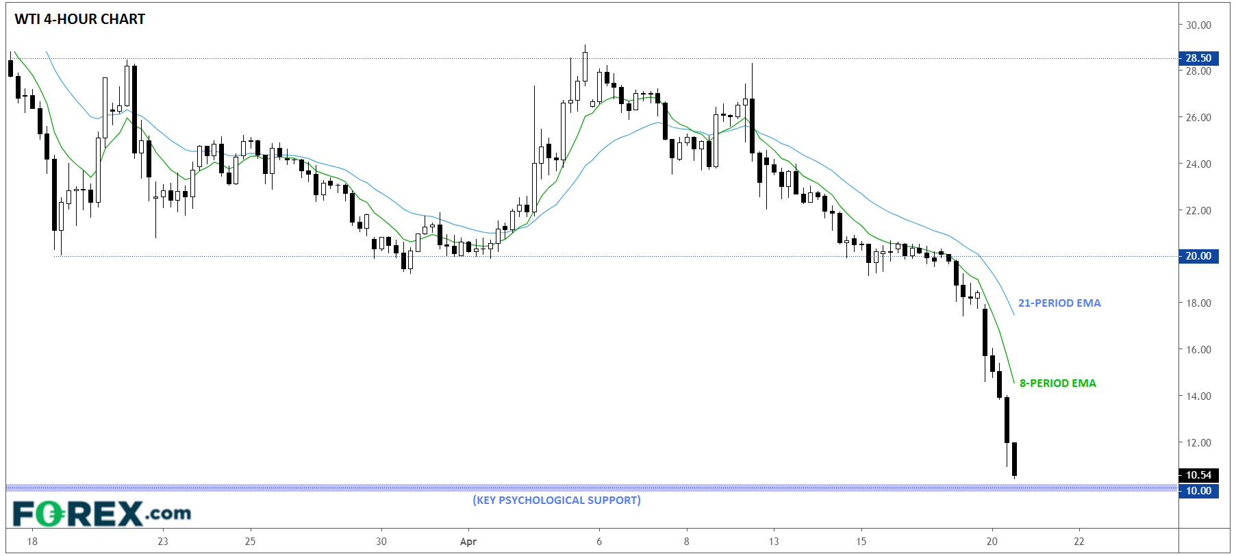 While the above is generally true, today’s price action in oil is certainly raising some eyebrows among even the most experienced traders. Using West Texas Intermediate as an example, the May futures contract, which expires tomorrow, is changing hands at just around $11.00 as of writing, down fully 40% today alone! Many less common forms of oil, including Bakken UHC, Alaska North Slope, Edmonton C5 condensate, and Edmonton mixed sweet, are all trading below $5.00 a barrel.