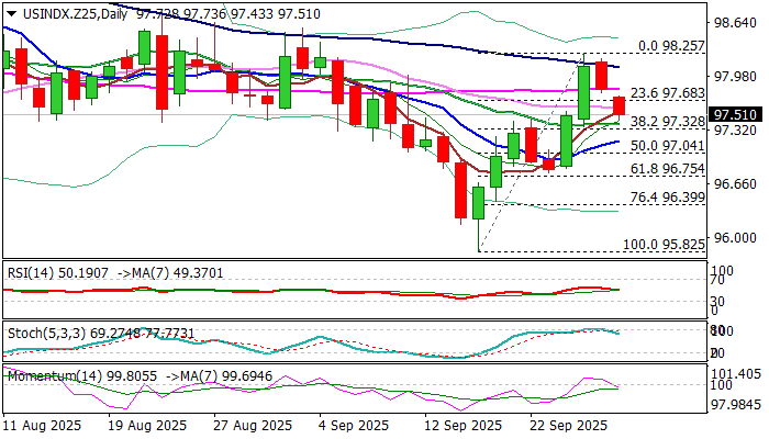 The dollar index stays in red for the second day, pressured by concerns about potential US government shutdown and brightened outlook for Fed rate cuts that partially offset positive impact from last week’s upbeat US economic data.