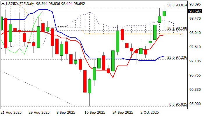 The latest rally surged through daily Ichimoku cloud (98.01 /98.40) and further improved positive technical picture on daily chart, although longer upper shadows on daily candles of Wed/today, suggest that bulls face headwinds from important barrier at 98.81 (50% retracement of 101.80/95.82/falling weekly Kijun-sen).