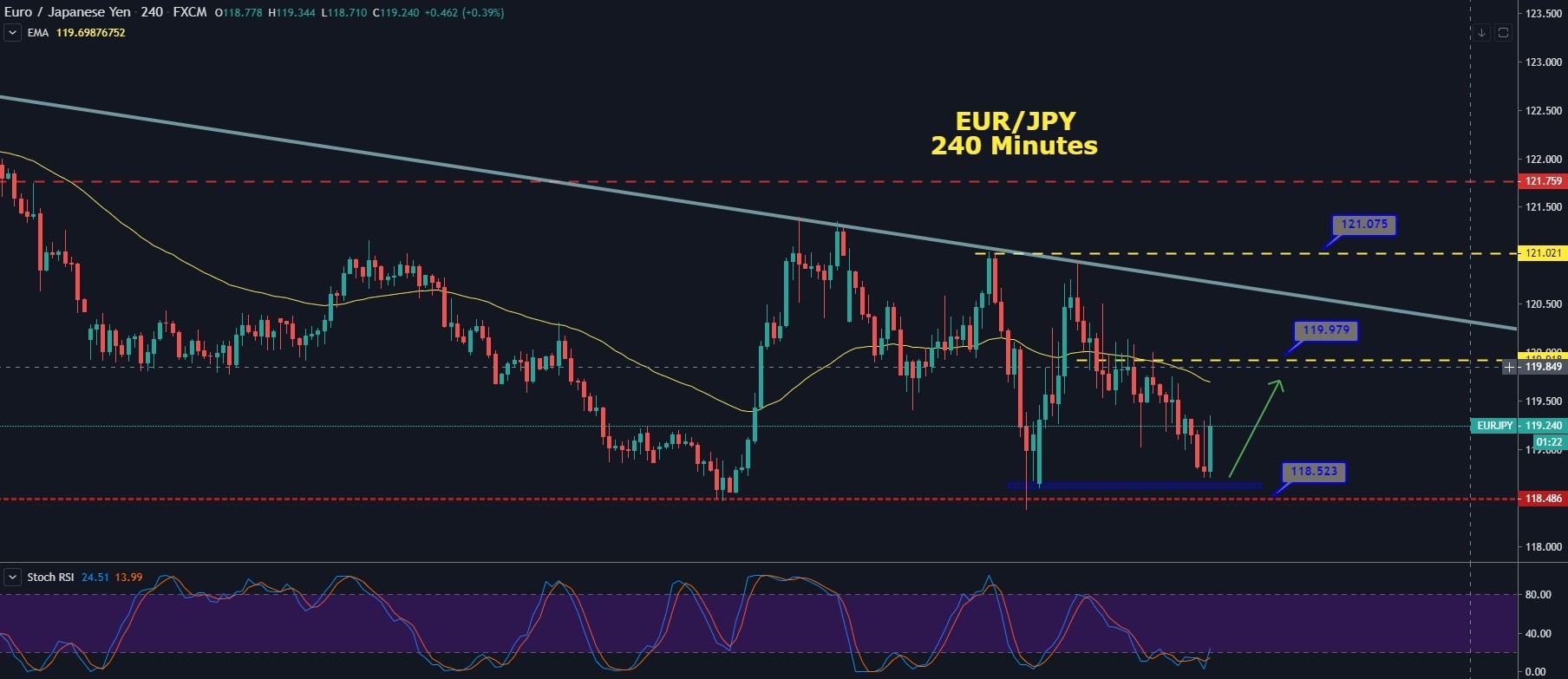 |The EUR/JPY trades well in line with our forecast to test the triple bottom support level of 118.500. Closing of the bullish engulfing candle on the 240 minutes chart is suggesting odds of a bullish reversal in the EUR/JPY.