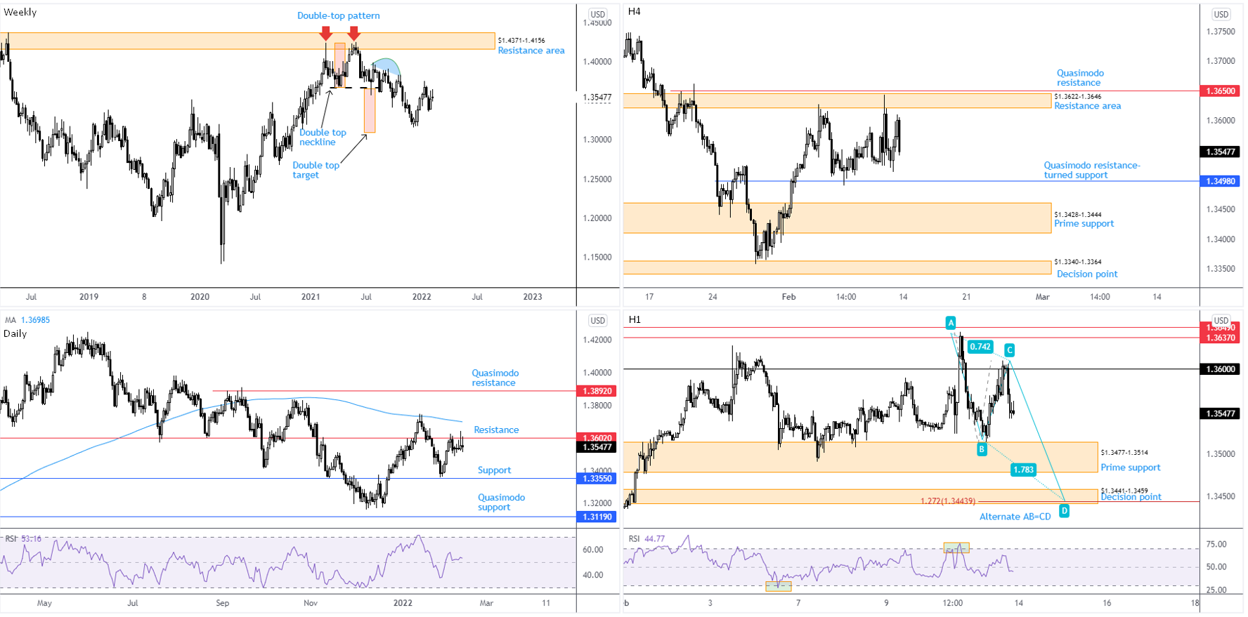 From the H1 timeframe, Friday retested the underside of $1.36 and unshackled the possibility of bringing in prime support at $1.3477-1.3514 (surrounds H4 Quasimodo support-turned resistance at $1.3498). However, as this prime zone has been tested, it could be fragile. Consequently, this throws the decision point at $1.3441-1.3459 in the mix, along with an ‘alternate’ AB=CD formation at $1.3444 (a 1.272% Fibonacci projection). What’s technically interesting is the H1 decision point shares space with the H4 prime support mentioned above at $1.3428-1.3444.