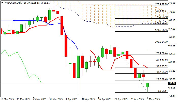 Immediate bears are expected to remain intact as long as today’s gap is unfilled, though extended upticks (which cannot be ruled out) should be ideally capped under $60.00 (50% retracement of $64.70/$55.14 bear-leg / psychological reinforced by daily Tenkan-sen) to keep near term bias with bears.