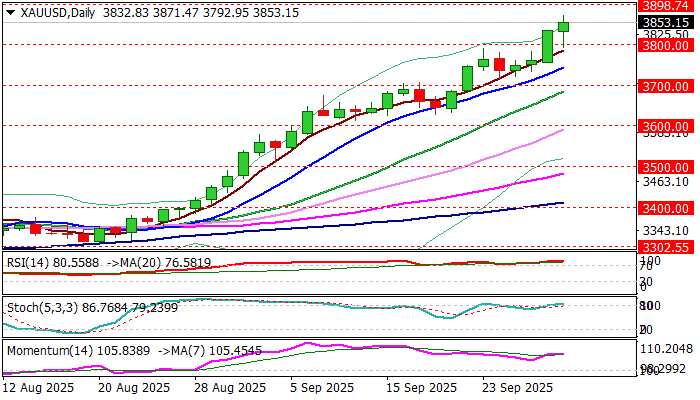 Gold spiked to new record high at $3871 on Tuesday, in extension of Monday’s strong acceleration higher when the metal advanced 2%, in a biggest daily gain since May 6.