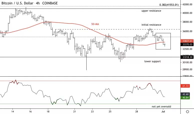 |Bitcoin (BTC) is under pressure after buyers took profits near $36,000 resistance on Tuesday. Lower support is seen around $30,000, which is the bottom of the month-long trading range.