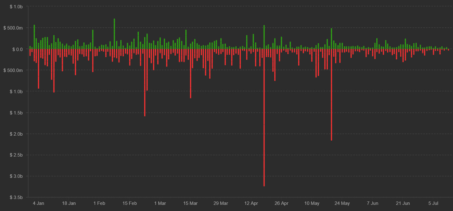 Since May 20, there hasn't been a single day where the 8-hour funding rate was higher than 0.05%. This evidence indicates that buyers are unwilling to use high leverage, and without it, it's harder to create $1 billion or higher liquidations.