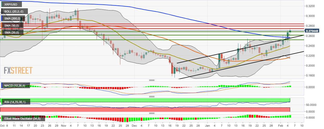 XRP/USD is on course of charting its fifth straight bullish day going up from $0.267 to $0.27 in the early hours of Wednesday. For the last four days, the price has been trending above the 20-day Bollinger Band, showing that the asset is overpriced.