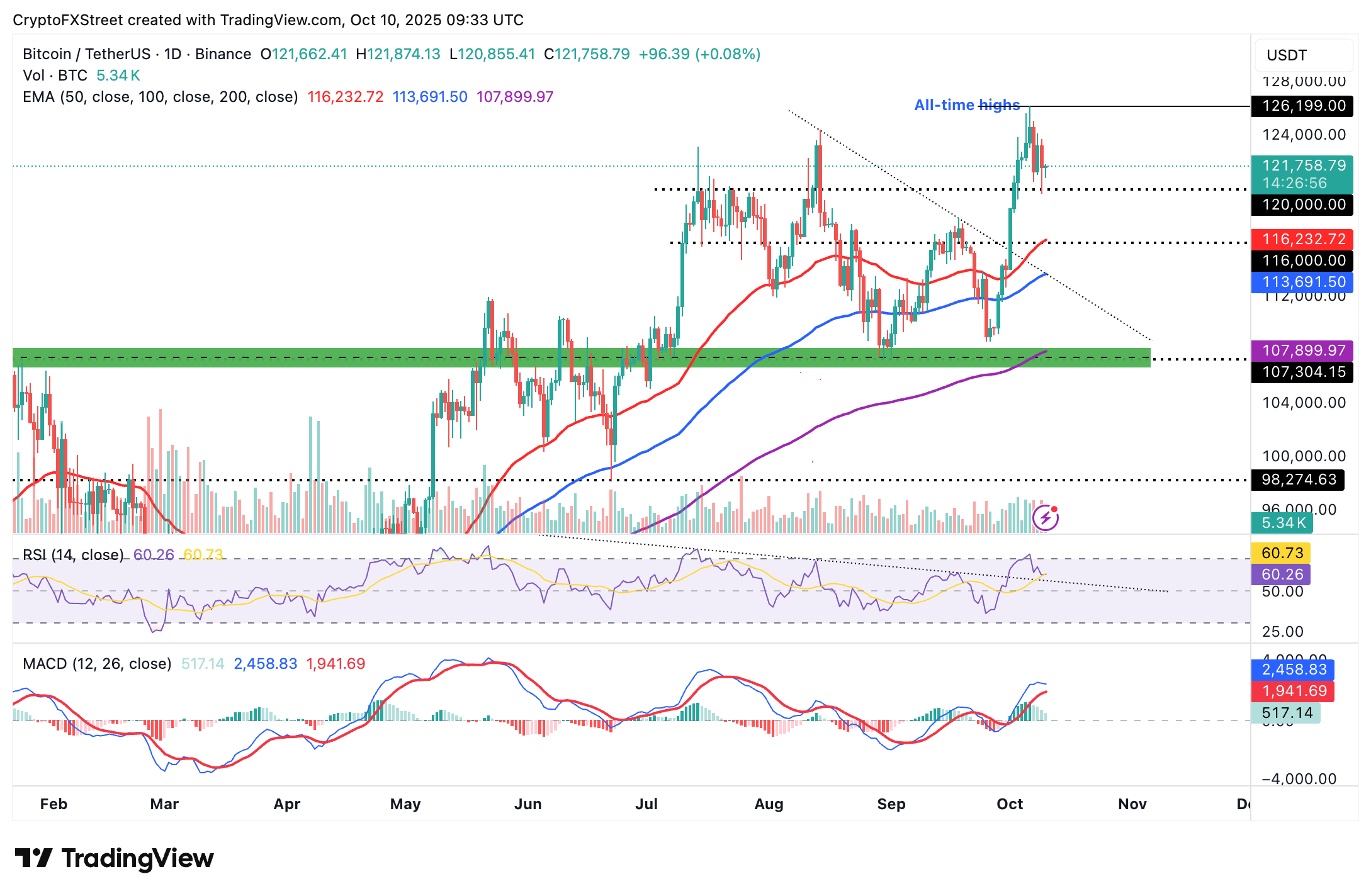 Bitcoin (BTC) trades above a short-term support range between $120,000 and $121,000 at the time of writing on Friday. Its technical outlook leans bearishly after correction from the record high of $126,199, reached on Monday. Key drivers of the pullback can be attributed to profit-taking and a sticky risk-off sentiment in the broader cryptomarket.
