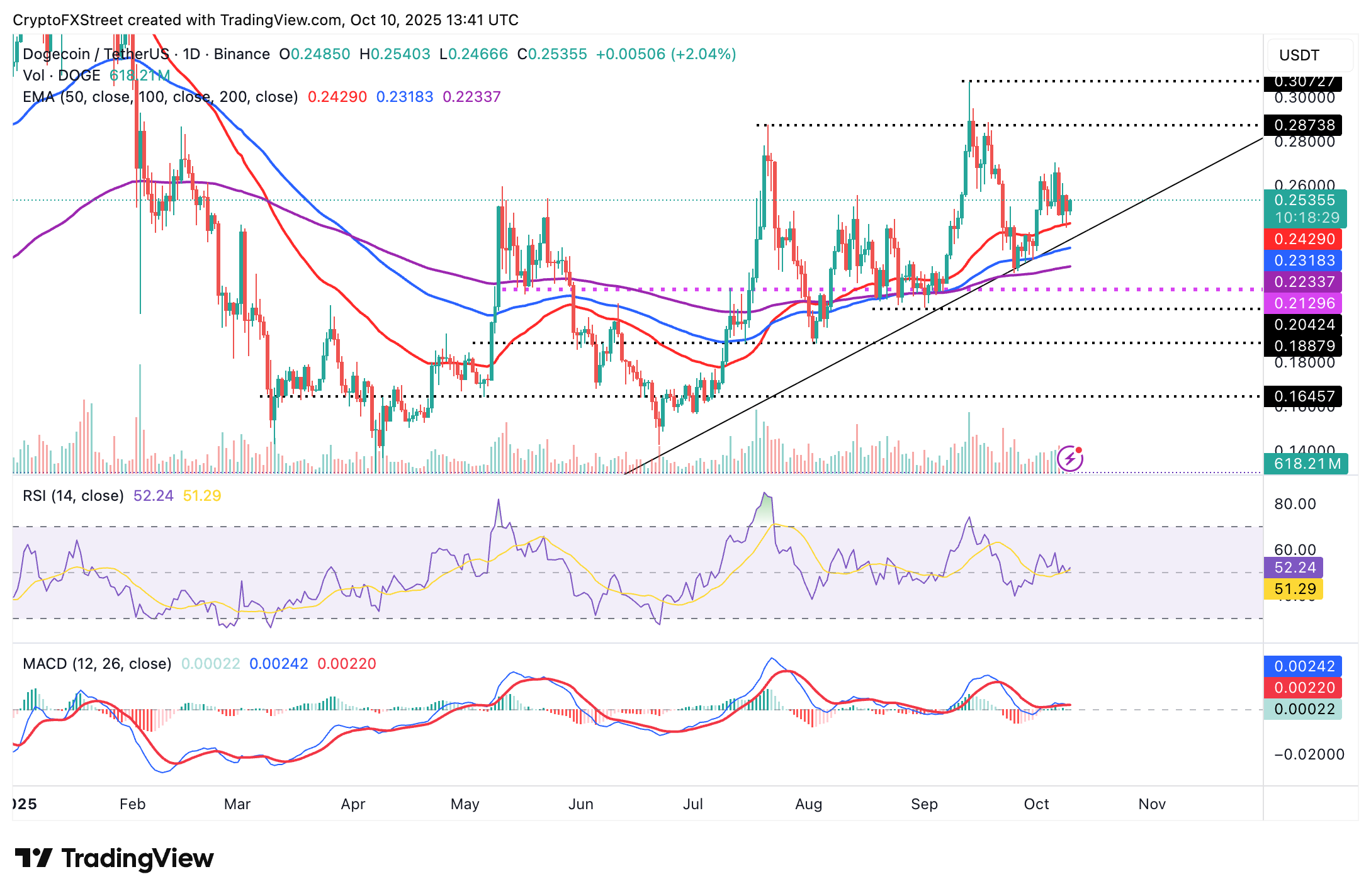 Dogecoin (DOGE) rises alongside Bitcoin (BTC) and other altcoin majors, trading above $0.25 on Friday, supported by improving risk-on sentiment in the broader cryptocurrency market.