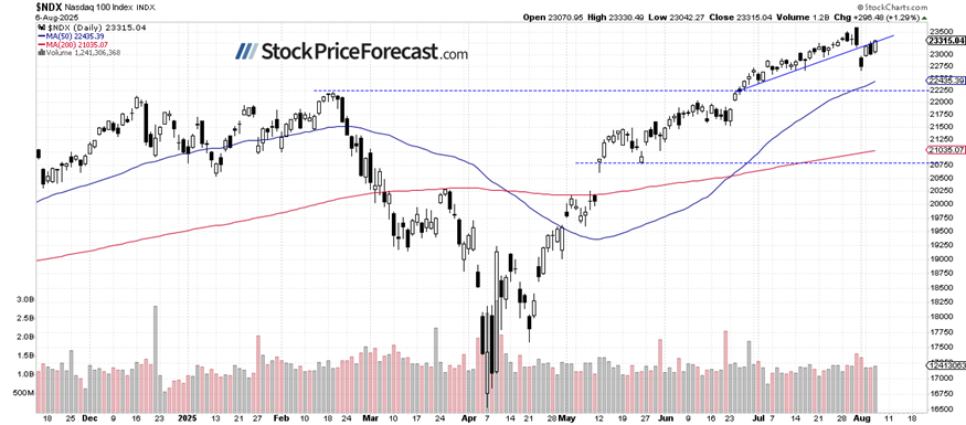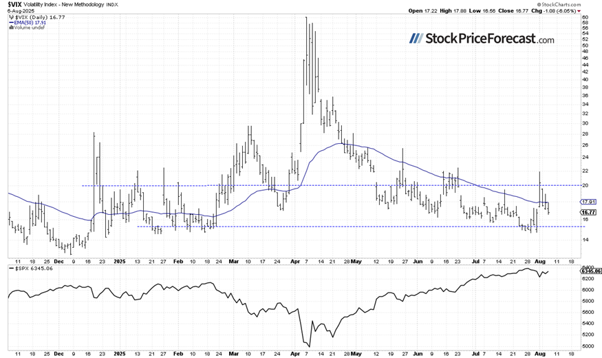 Last Friday’s sell-off pushed the VIX (Volatility Index) to 21.90 - its highest level since June 23 - but it has been declining since, reaching a local low of 16.56 yesterday.