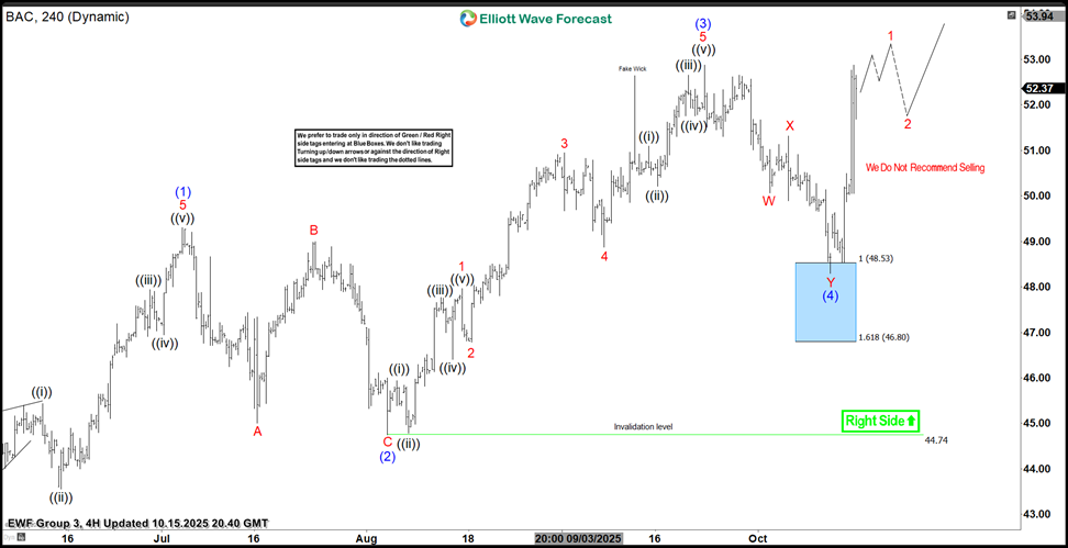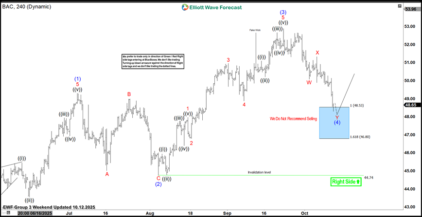 The current analysis suggests that BAC stock is forming a wave (4) pull back, which is unfolding as an Elliott Wave Double Three pattern . Blue Box comes at 48.53-46.8. That is our buying zone. We recommend members avoid selling BAC stock, as the main trend remains bullish. We anticipate at least a 3-wave bounce from this Blue Box area. Once the price touches the 50% fib level against the X red connector, we’ll make positions risk-free, set the stop-loss at breakeven, and book partial profits. Stop Loss is placed a few points below 1.618 fib extension : 46.8.
