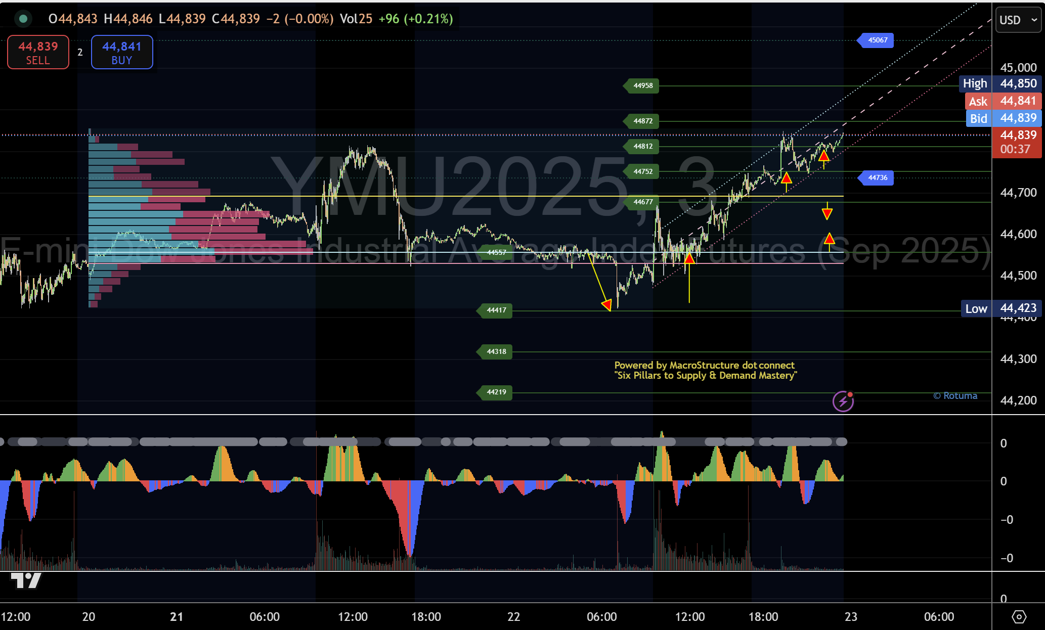 Tuesday's pullback and rebound: YM1: Sep '25 Dow futures dipped from 44,557 but held just above the micro‑5 lower range at 44,417, reaffirming support and preventing a deeper sell‑off.