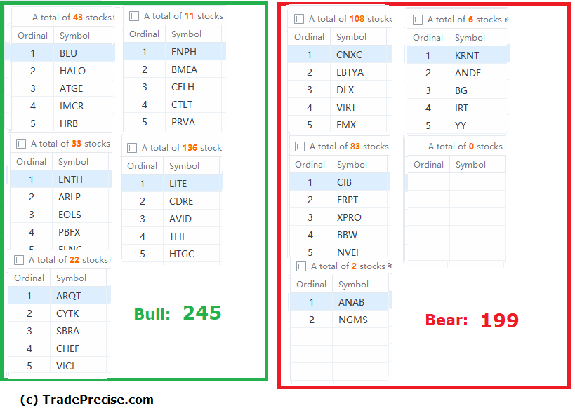 The bullish setup vs. the bearish setup is 245 to 199 from the screenshot of my stock screener below. The sharp drop in the bearish setup and mild increase in the bullish setup from last week are encouraging signs for the bullish scenario, which is also reflected in the improvement of the market breadth as explained last week.