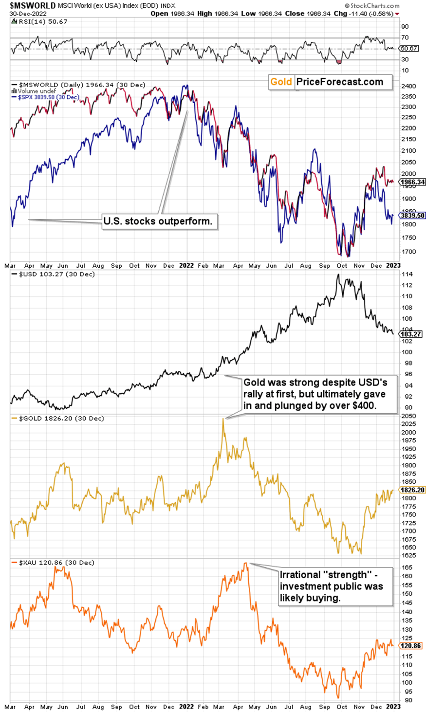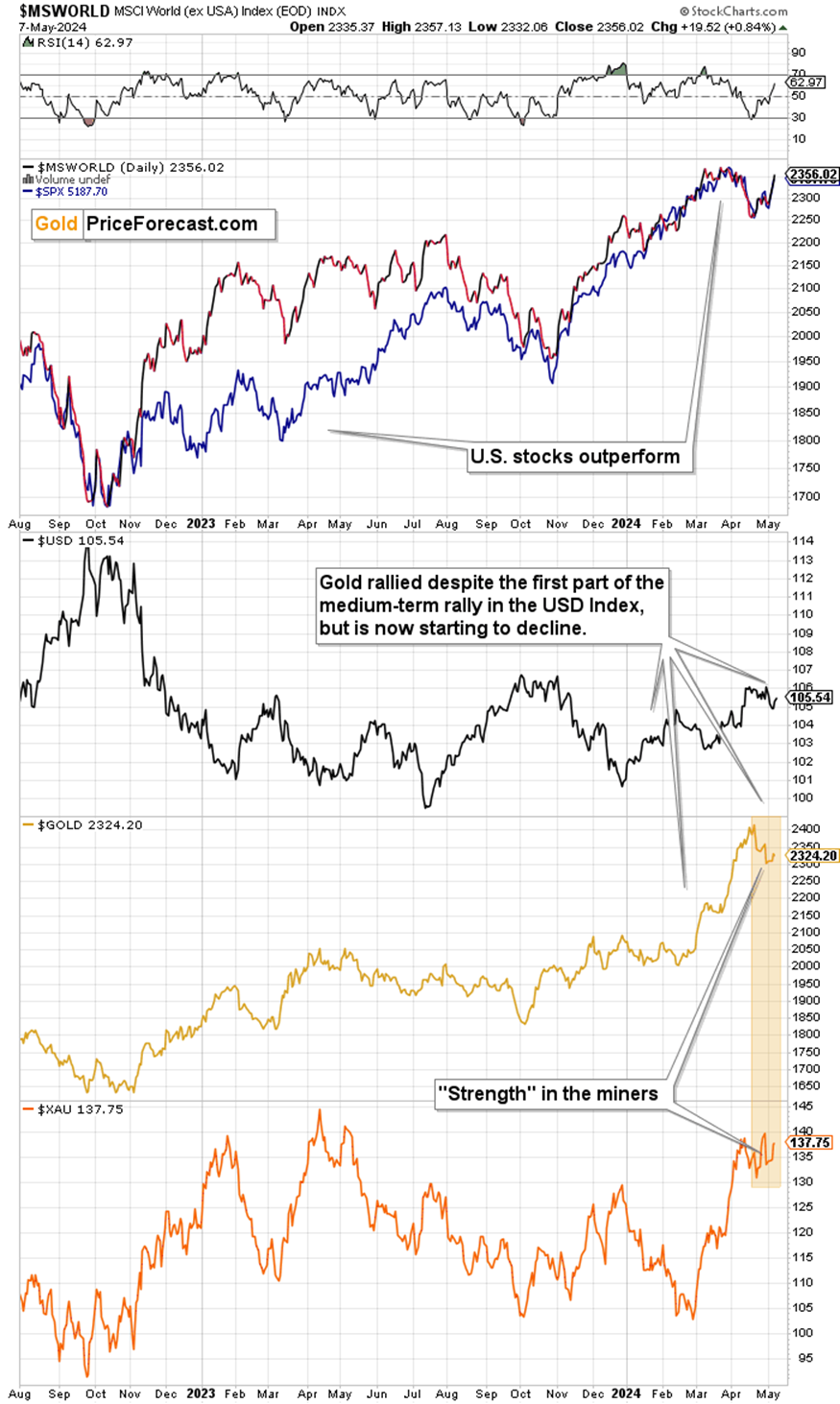 Starting with point 4, we see a reaction that’s more or less in the middle of what we saw in 2008 and 2022. The U.S. stocks are rallying more than world stocks, and their outperformance is visible, particularly since the beginning of 2023, but it’s not the case that the world stocks stopped at their short-term highs. They stopped at their long-term highs, though, suggesting that the situation is indeed rather similar.
