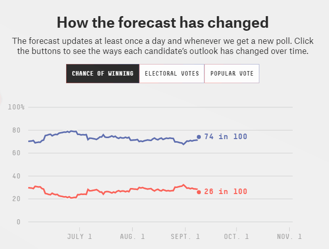 Nate Silver's FiveThirtyEight is showing Biden has a 74% chance of winning, up from 71% when the model was launched in early August. That means Trump received no convention bounce. The latest push toward the Democrat came from an NBC poll showing a nine-point lead for Biden in Pennsylvania, a key battleground state that Trump carried in 2016.