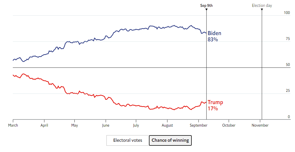The Economist's model is showing sliding chances for a Biden victory – but he still has a broad 83% probability of replacing Trump at the White House according to the magazine's model.