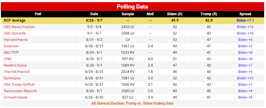 RealClearPolitics is pointing to a Biden lead of 7.1% in national polls, mostly unchanged from several weeks ago. The RCP Average does not include the latest Ipsos poll pointing to a 12-point gap.