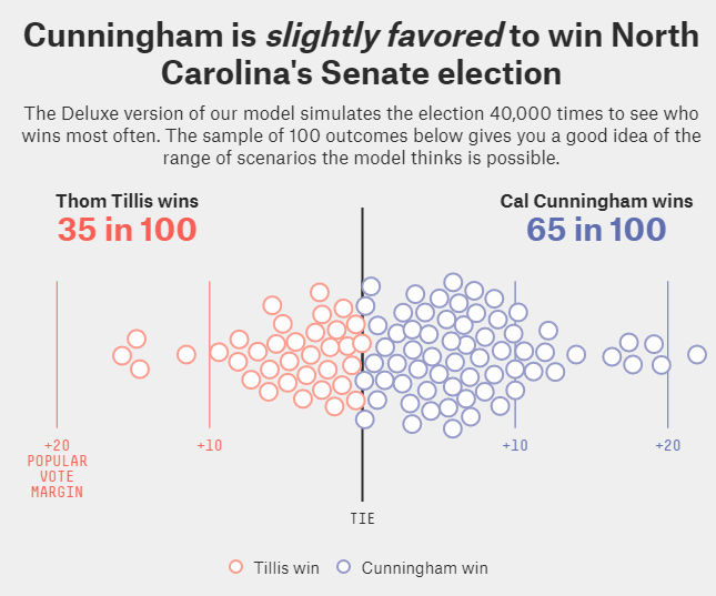 The opposition party's best shot is in North Carolina, where incumbent Republican Thom Tillis marginally behind Democratic challenger Cal Cuningham. According to FiveThirtyEight, Cuningham is only "slightly favored" to win: