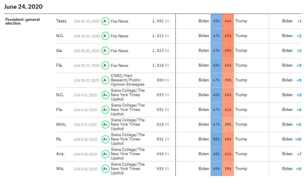 As of late June 2020, Biden receives 50.6% – an outright majority – while Trump stands at 41.4%. Together they already have 92%, above November 2016 levels.