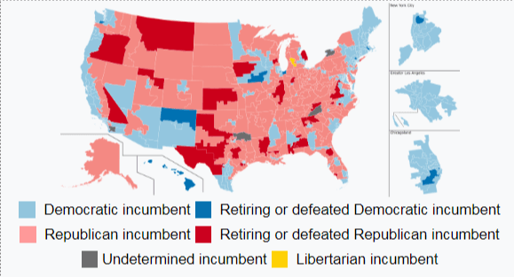 Democrats, led by Speaker Nancy Pelosi, currently control the House, with 233 seats. Representatives are voted for a two-year term.