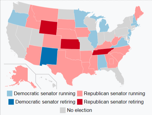 Republicans led by Majority leader Mitch McConnell, currently command control of the Senate with 53 seats. They are defending 23 and Democrats 12 in the upcoming vote. Senators are elected for six-year terms.