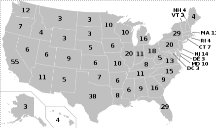 The president is elected via the Electoral College system. The candidate that wins most votes in each of America's 50 states and the Capital District of Colombia wins all the electors for that state, with two minuscule exceptions. The total number of elections is 538, and 270 are needed to clinch the victory. The minimum is three electors, and California has the maximum number of electors, 55.
