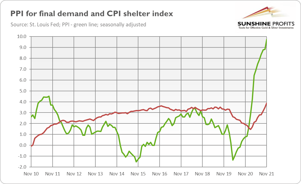 However, what is one of my biggest worries for the next year (except for the perspective of being eaten by hungry neighbors) is how gold will react to the peak in inflation. Although inflation will stay elevated, it won’t rise indefinitely. When it peaks, real interest rates could go up, negatively affecting the yellow metal.