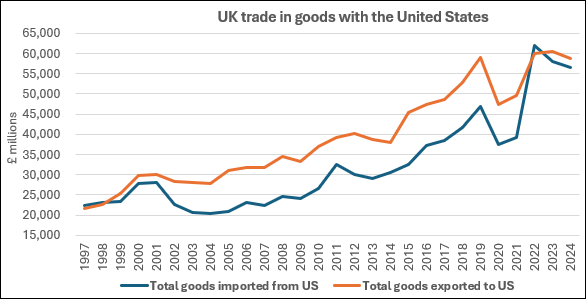 In 2024, the UK exported £58.7 billion in goods to the US and imported £56.6 billion of US goods – creating a narrow trade surplus of £2.1 billion.