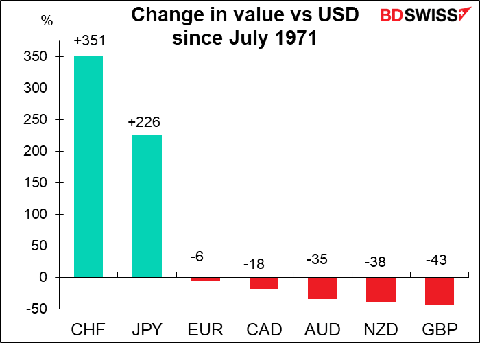 Nixon went on TV on Sunday while financial markets were closed and announced that “I have directed Secretary Connally to suspend temporarily the convertibility of the dollar into gold or other reserve assets, except in amounts and conditions determined to be in the interest of monetary stability and in the best interests of the United States.” That “temporary” action has proved to be quite long-lasting!